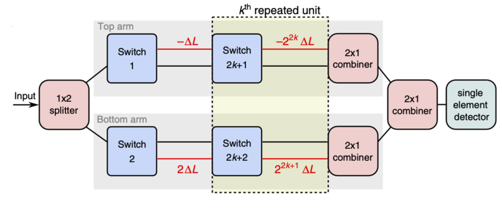 The unique circuit design allows exponential performance scaling with the number of switches. Each pair of switches that are added to the circuit result in a two-fold increase in the spectral channel number increasing spectral resolution. Figure 2 shows the experimental setup and resulting transmission spectra for a design with six switches, resulting in 64 path length permutations. The spectrometer uses an elastic-D1 spectrum reconstruction algorithm to recover an approximation of the input spectrum, with a resolution determined by the number of path length permutations.